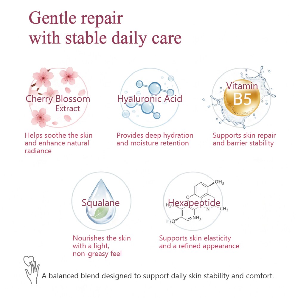 Extrait de fleur de cerisier, acide hyaluronique, vitamine B5, squalane, peptides